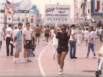 Although THE Skipper does not currently have a regular skipping practice, his passion for skipping as a form of locomotion still knows no bounds.  He officially went into skipping retirement in 1990 after local officials refused to give him the permits he needed to keep his skipping business alive. (Clients paid him to skip around town carrying a billboard as Bill is demonstrating in the picture above that was taken in Atlantic City.)